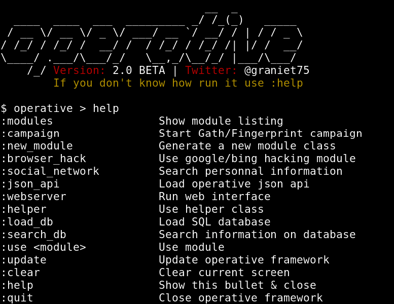 Para obter o Operative Framework, você deve seguir a sequência de comandos abaixo. Ela fará com que, clone o diretório Git no diretório corrente do seu ambiente. Após isso, você irá mudar para o diretório do framework e instalar os requerimentos necessários para que ele funcione. Por fim, irá executá-lo.