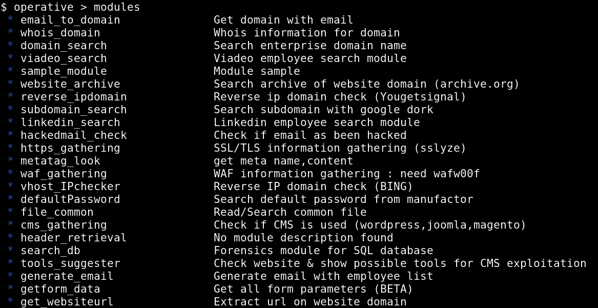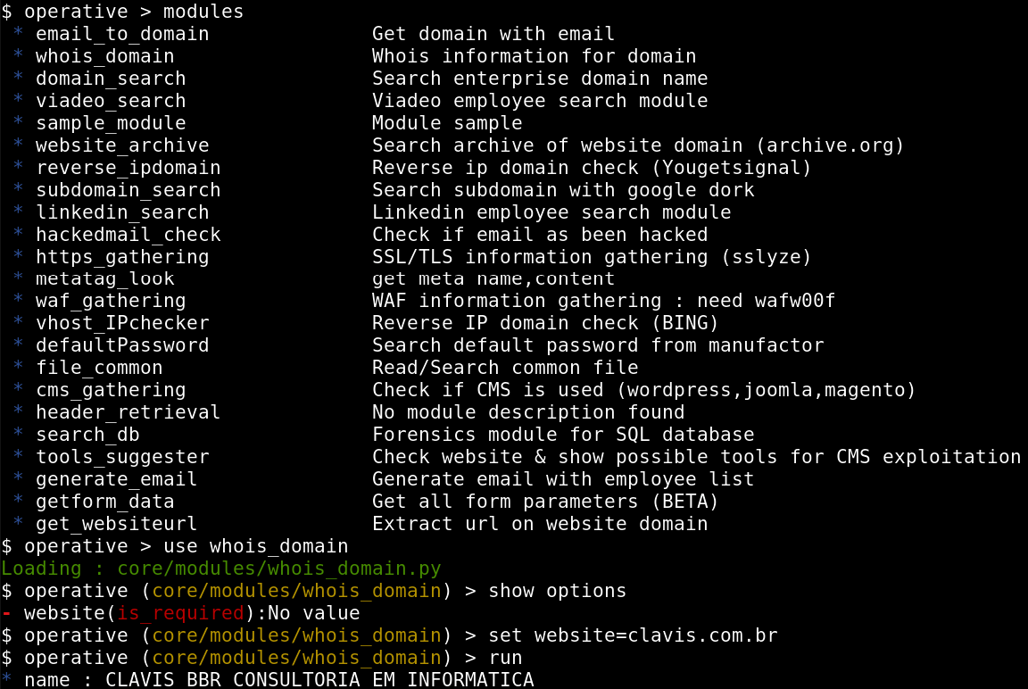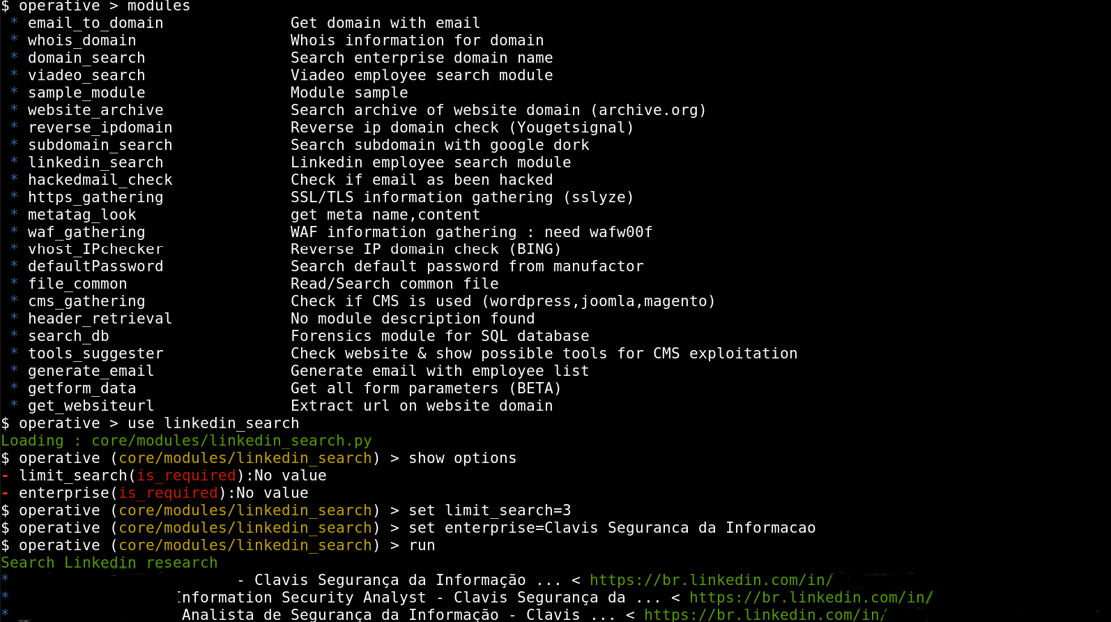 O Operative Framework possui duas versões: simples e a HD. Pela facilidade dos requerimentos, ao longo deste post, utilizaremos a versão simples. Esta ferramenta de inteligência de código aberto (OSINT) baseada em Python, é utilizada para coletar informações públicas sobre sites, empresas e pessoas. Ela é capaz de realizar buscas por funcionários de uma organização, perfis do Linkedin, e-mails, subdomínios, informações do Whois, dentre outras.