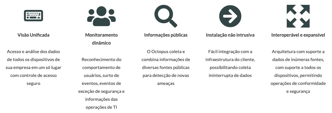 O principal objetivo do Octopus é aumentar a visibilidade das ameaças e fornecer inteligência de segurança, por meio de alertas, relatórios e dashboards, utilizando dados contextualizados de seu negócio e enriquecidos com fonte de inteligência internas e externas.